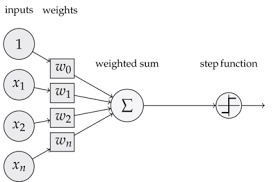 \[ \phi(z) = \begin{cases} 1 & \text{if } z = w_1 x_1 + w_2 x_2 + ... + w_n x_n - \theta > 0 \\ -1 & \text{if } z = w_1 x_1 + w_2 x_2 + ... + w_n x_n - \theta \le 0 \end{cases} \]パーセプトロンへの入力信号の荷重和\( z \)は\( w_0 = - \theta \)と置くと、一般的に